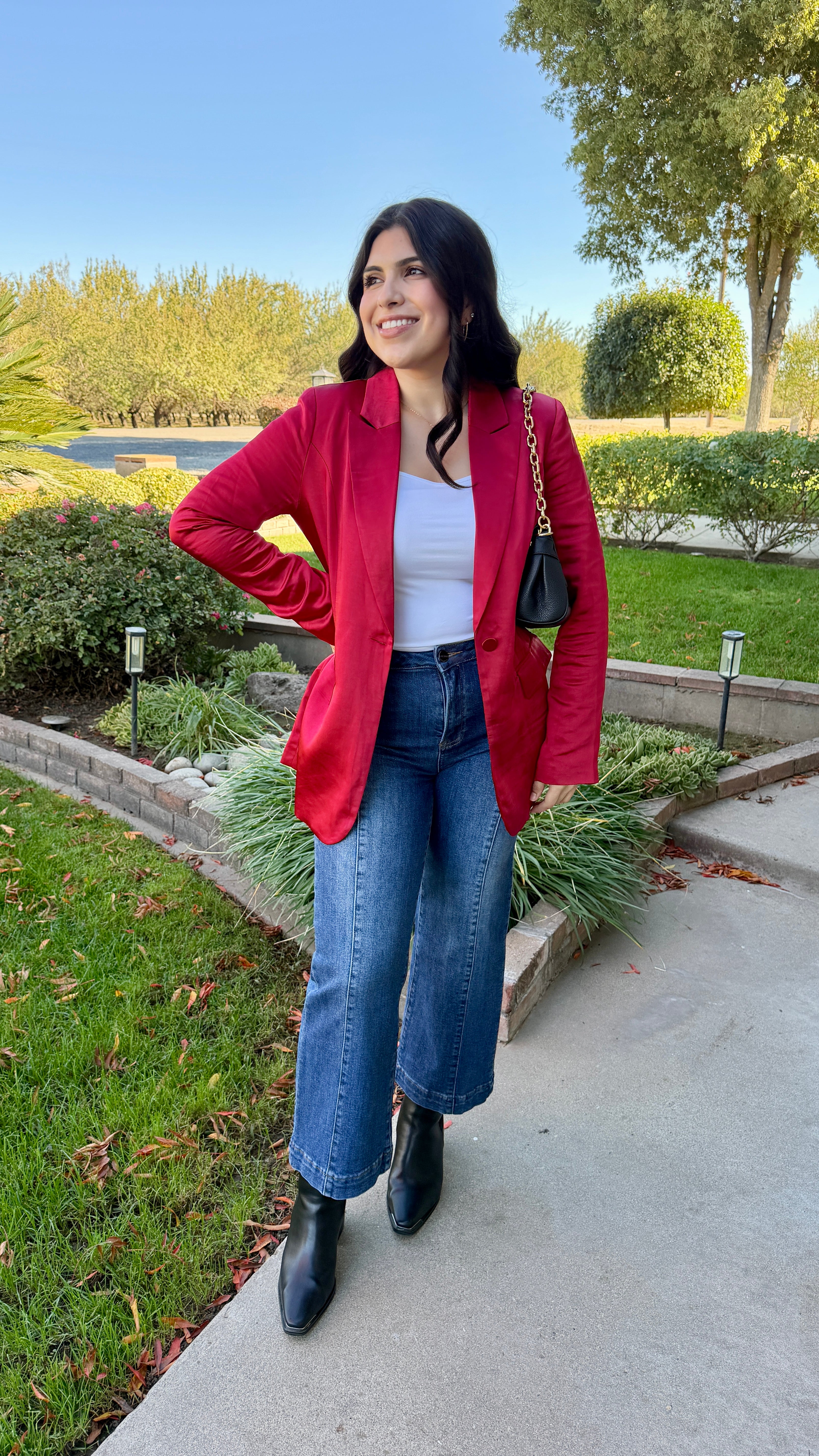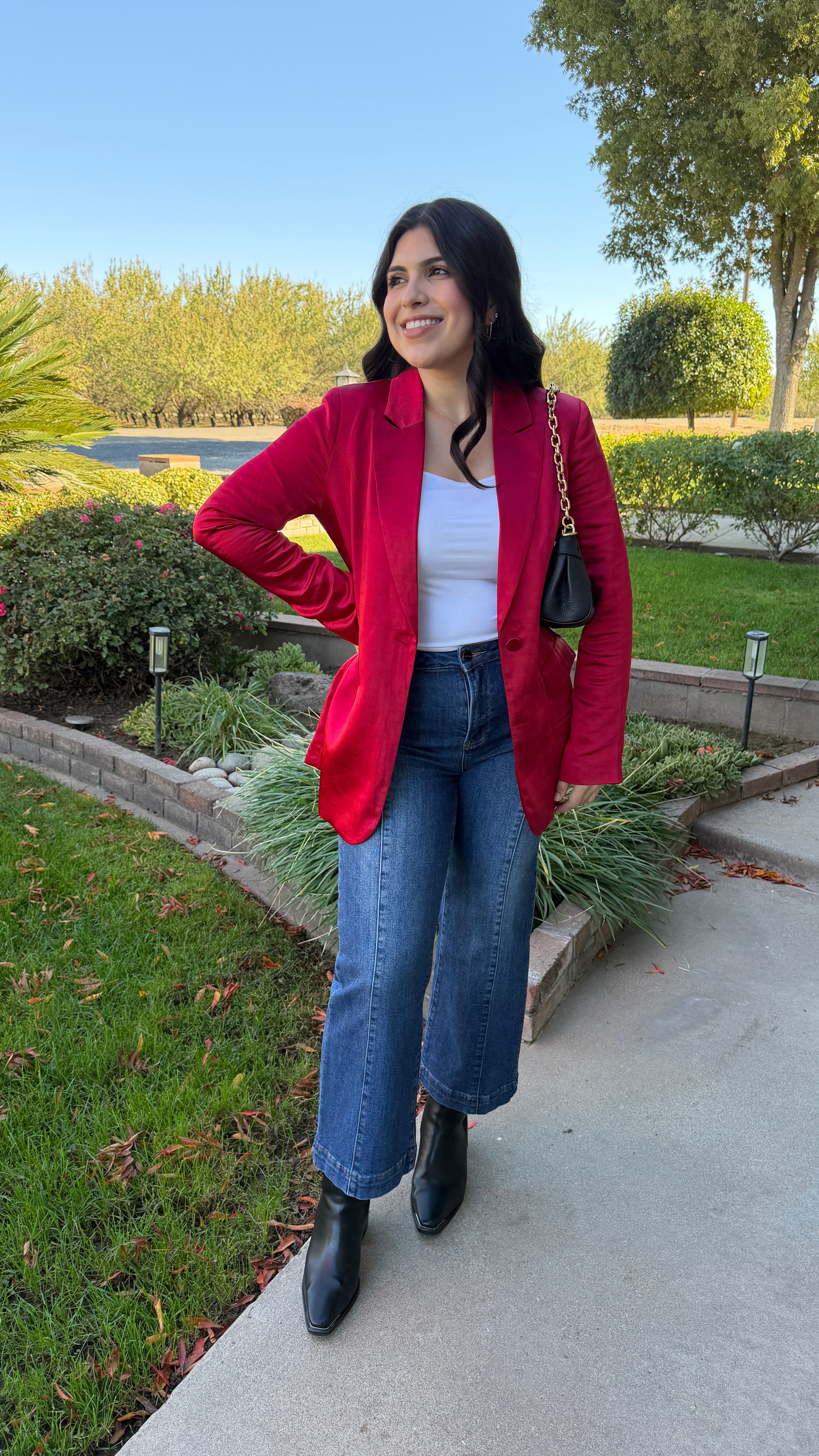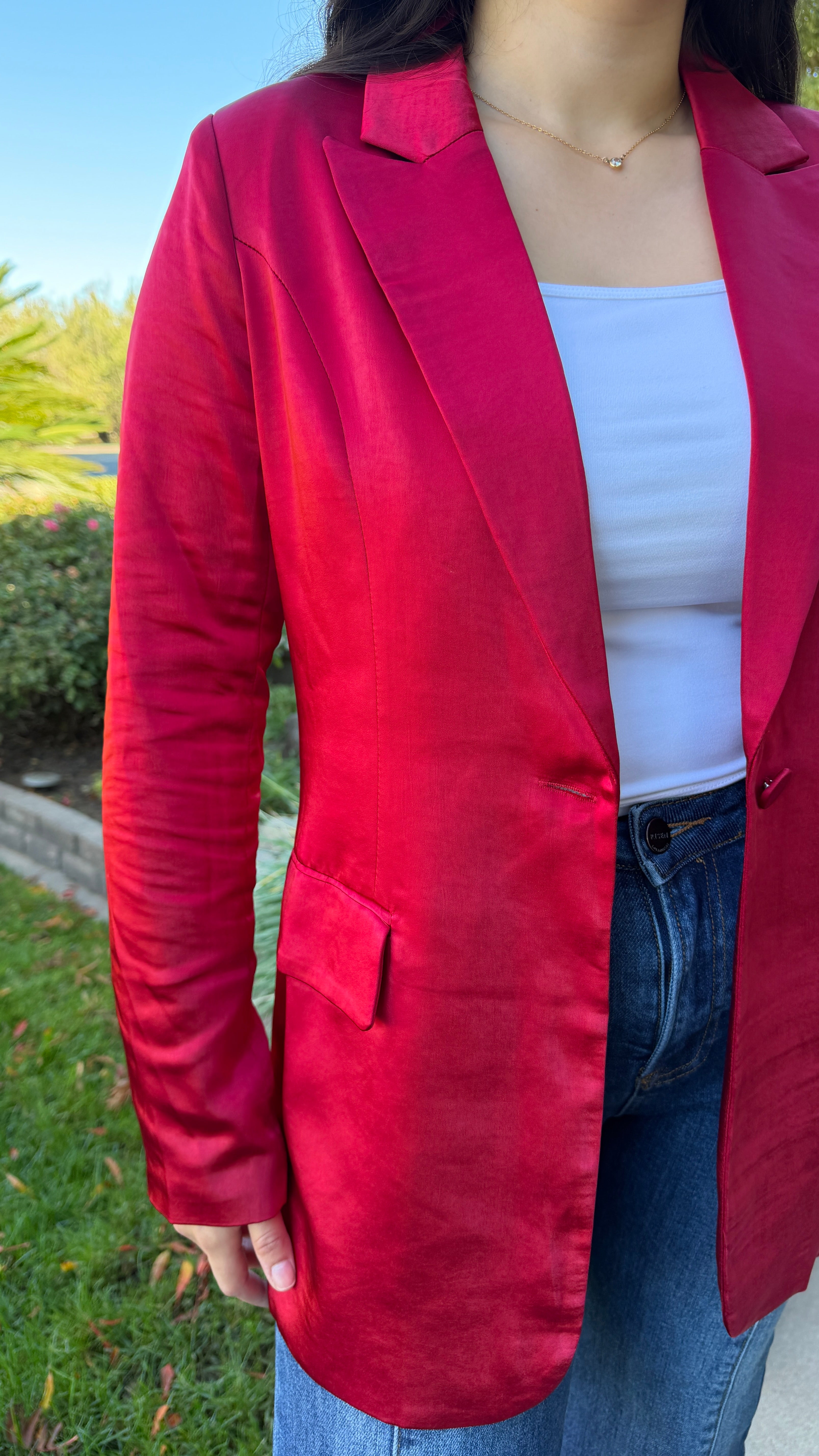 Make a statement in this sleek red satin blazer — the perfect mix of bold and sophisticated. Designed with a smooth satin finish and a classic one-button closure, this long sleeve blazer adds instant polish to any outfit. Whether you’re dressing up for a holiday party, a night out, or a special occasion, it’s sure to turn heads.