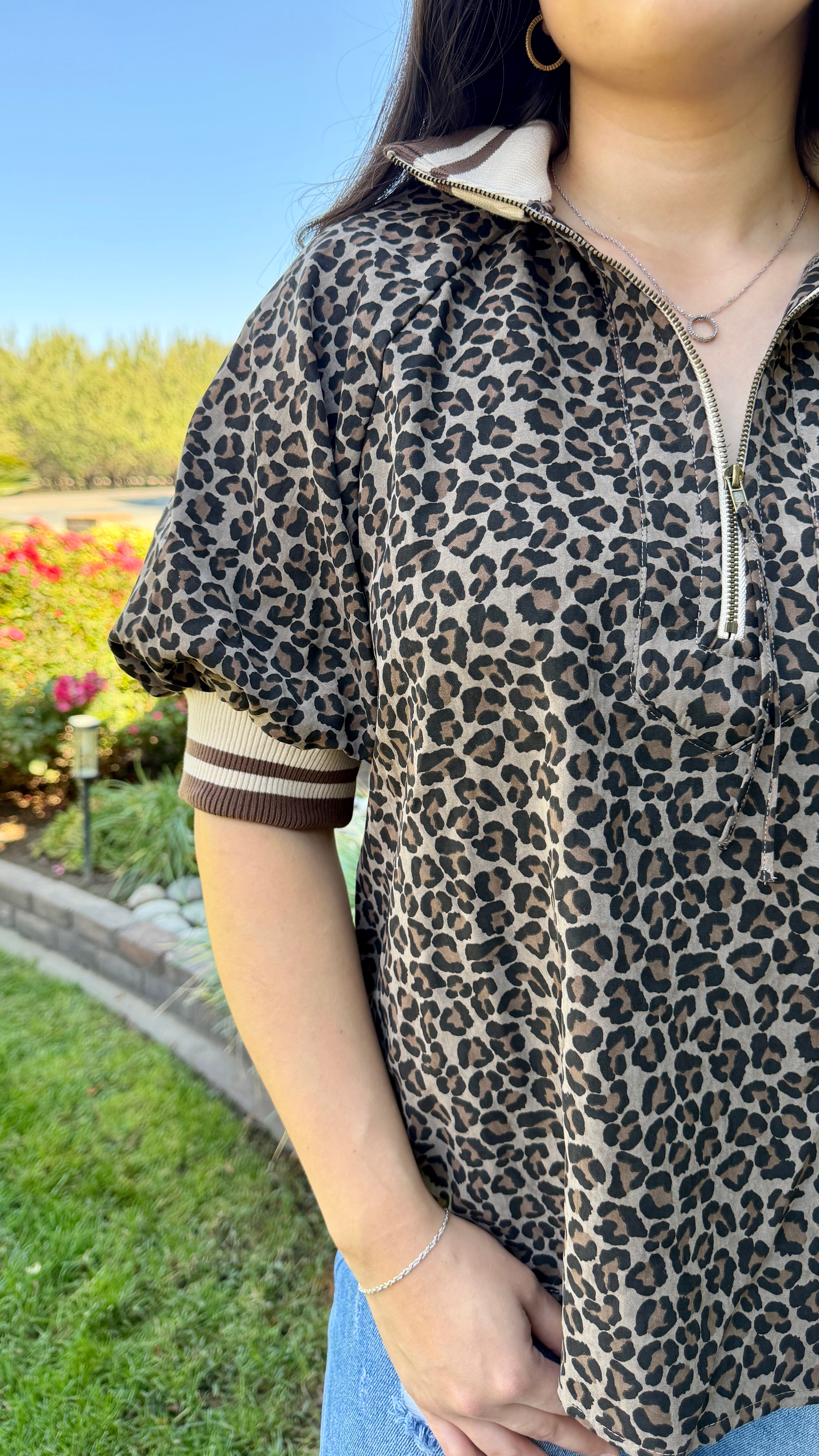 Add a bold, playful touch to your wardrobe with this leopard print top featuring puff sleeves and a structured collar. The quarter-zip detail gives it a modern edge, making it perfect for dressing up or keeping it casual. Soft, comfortable, and easy to wear, this top is a versatile piece you’ll reach for again and again.