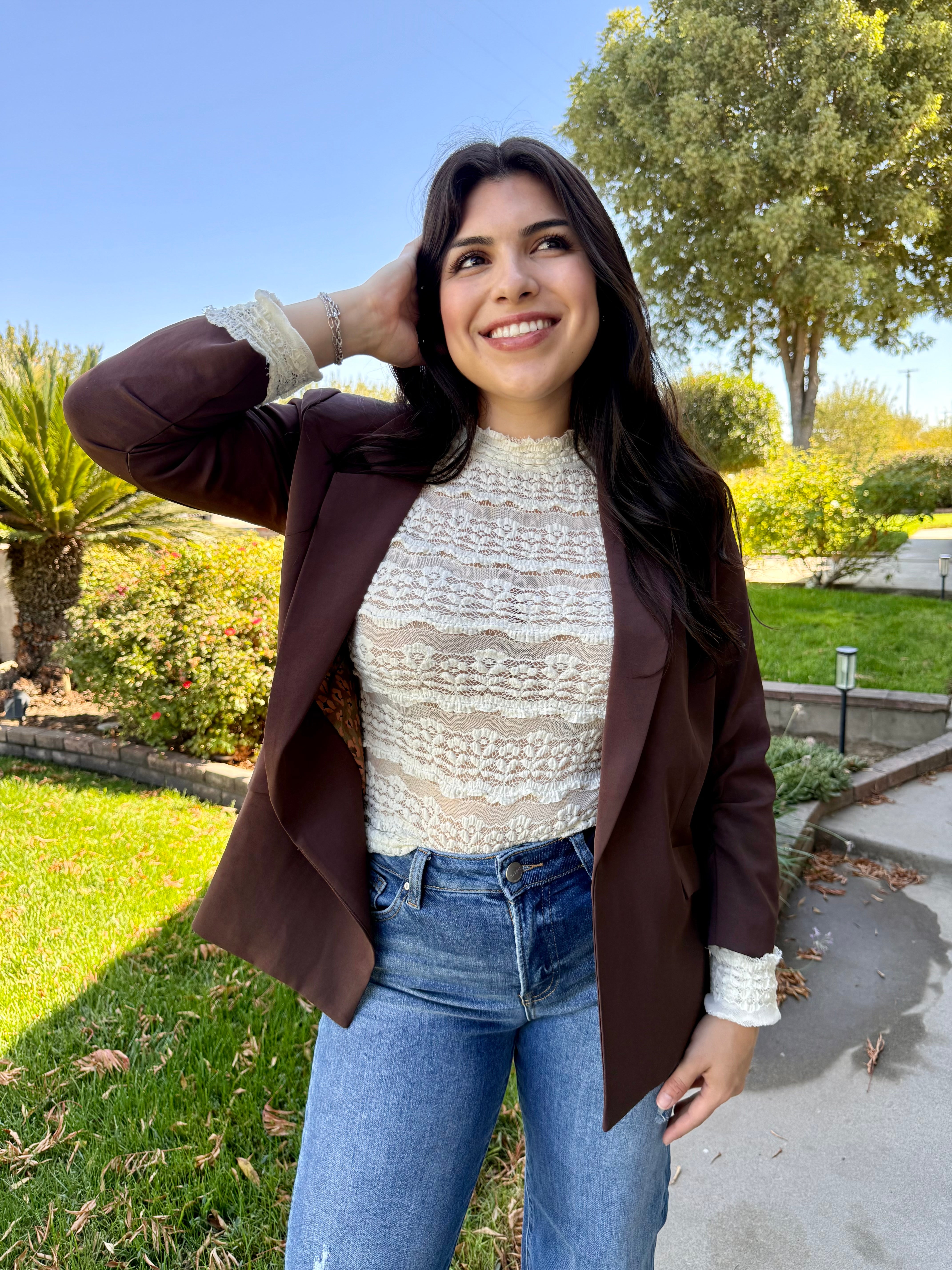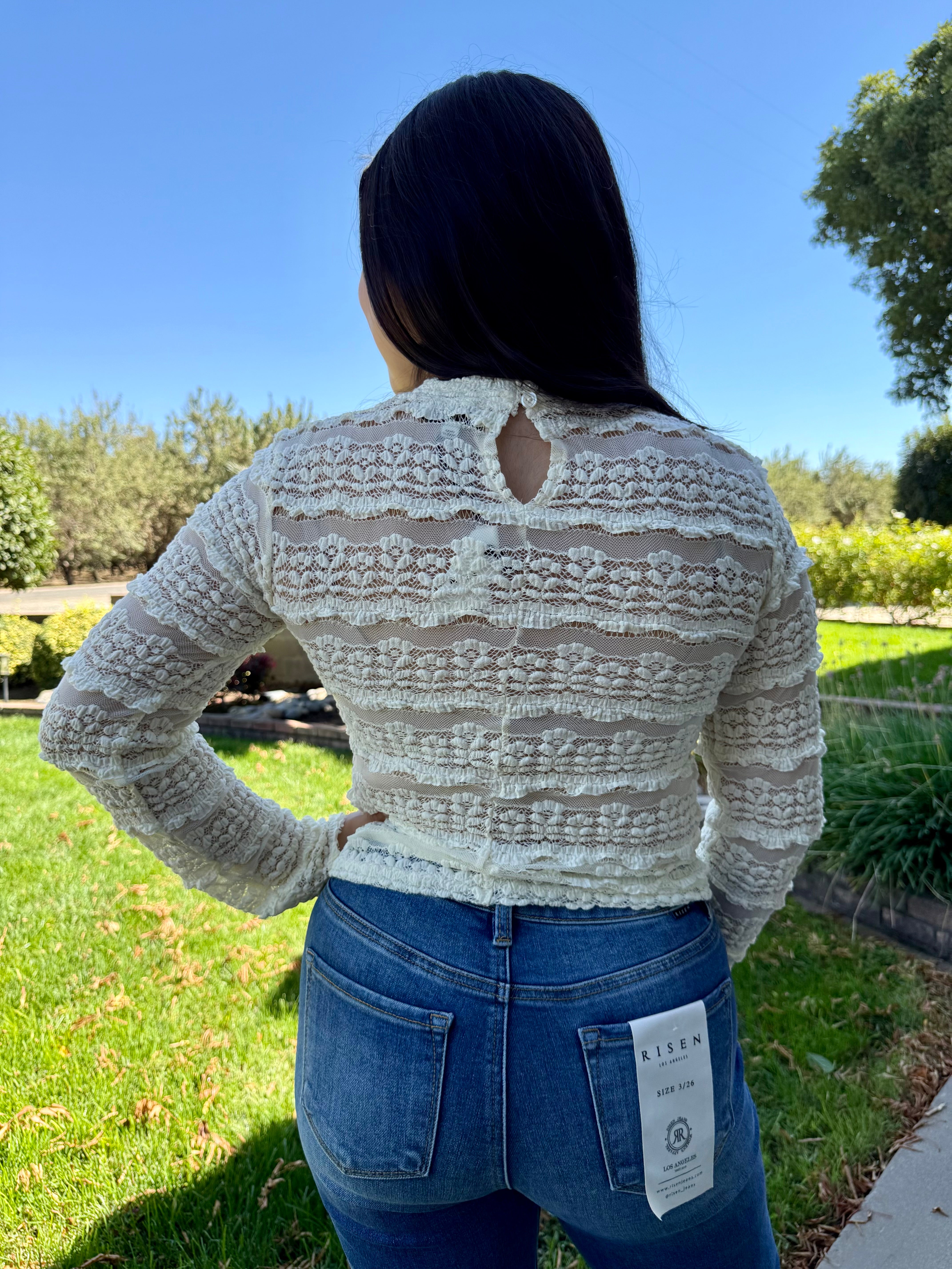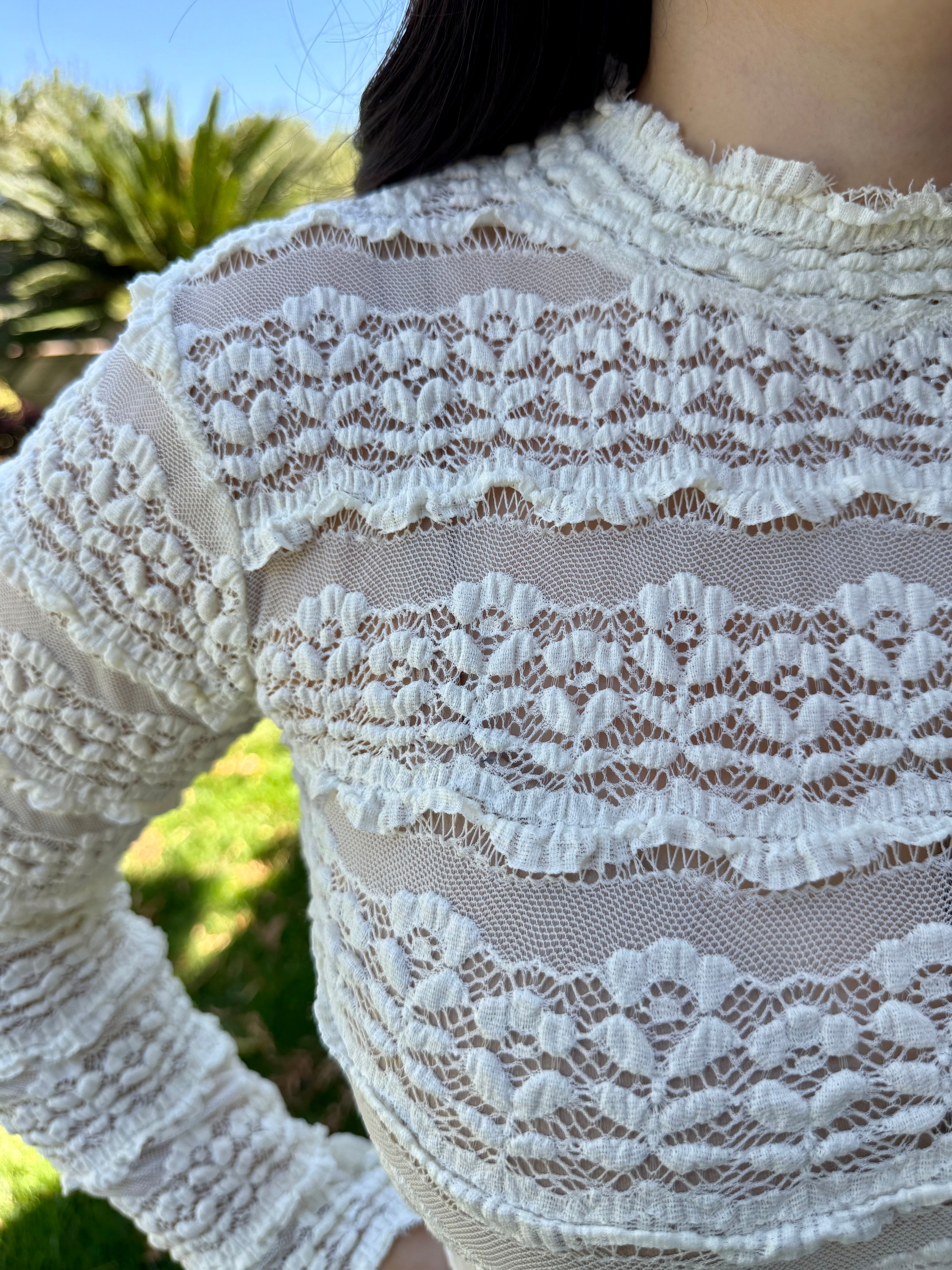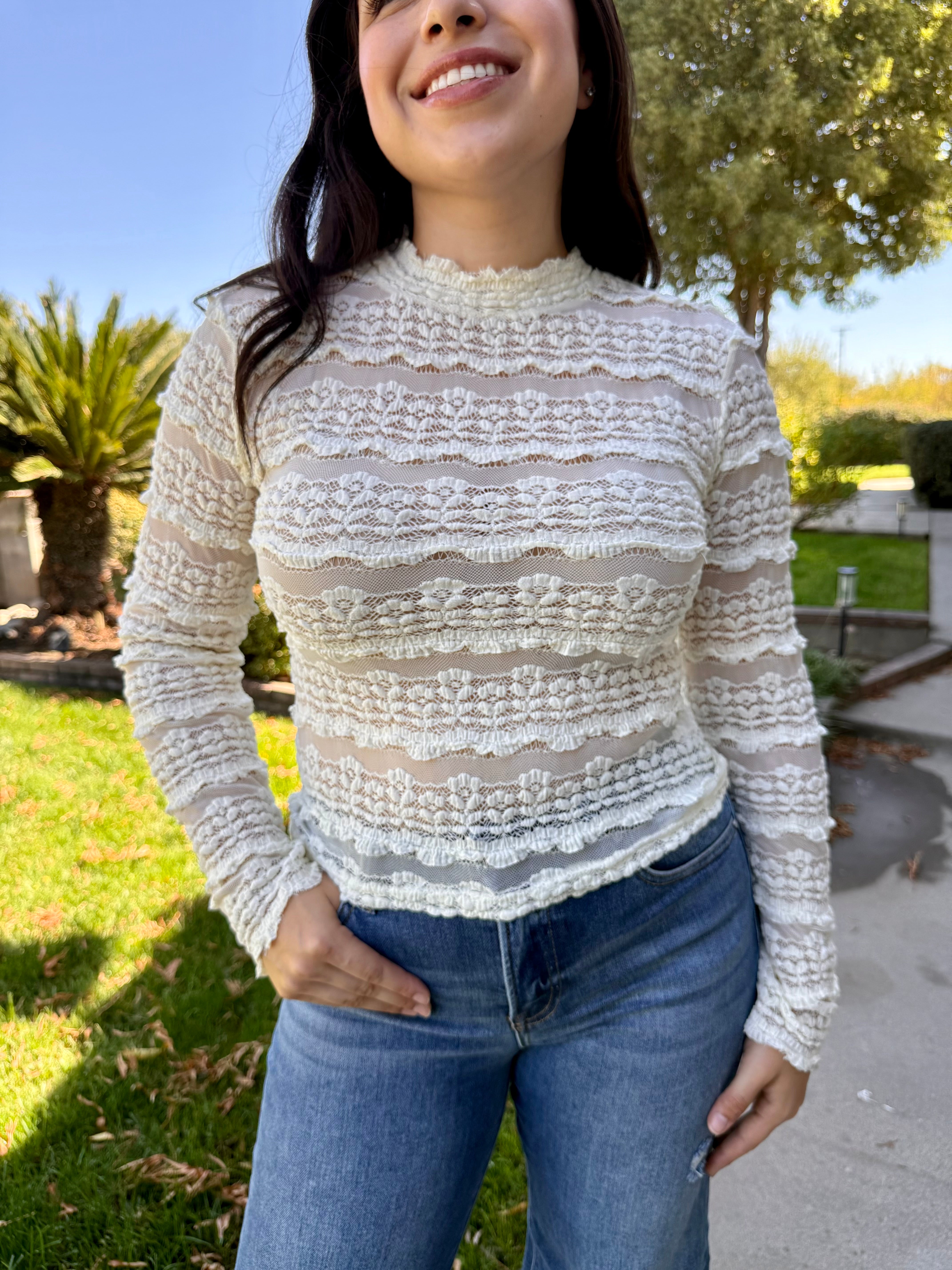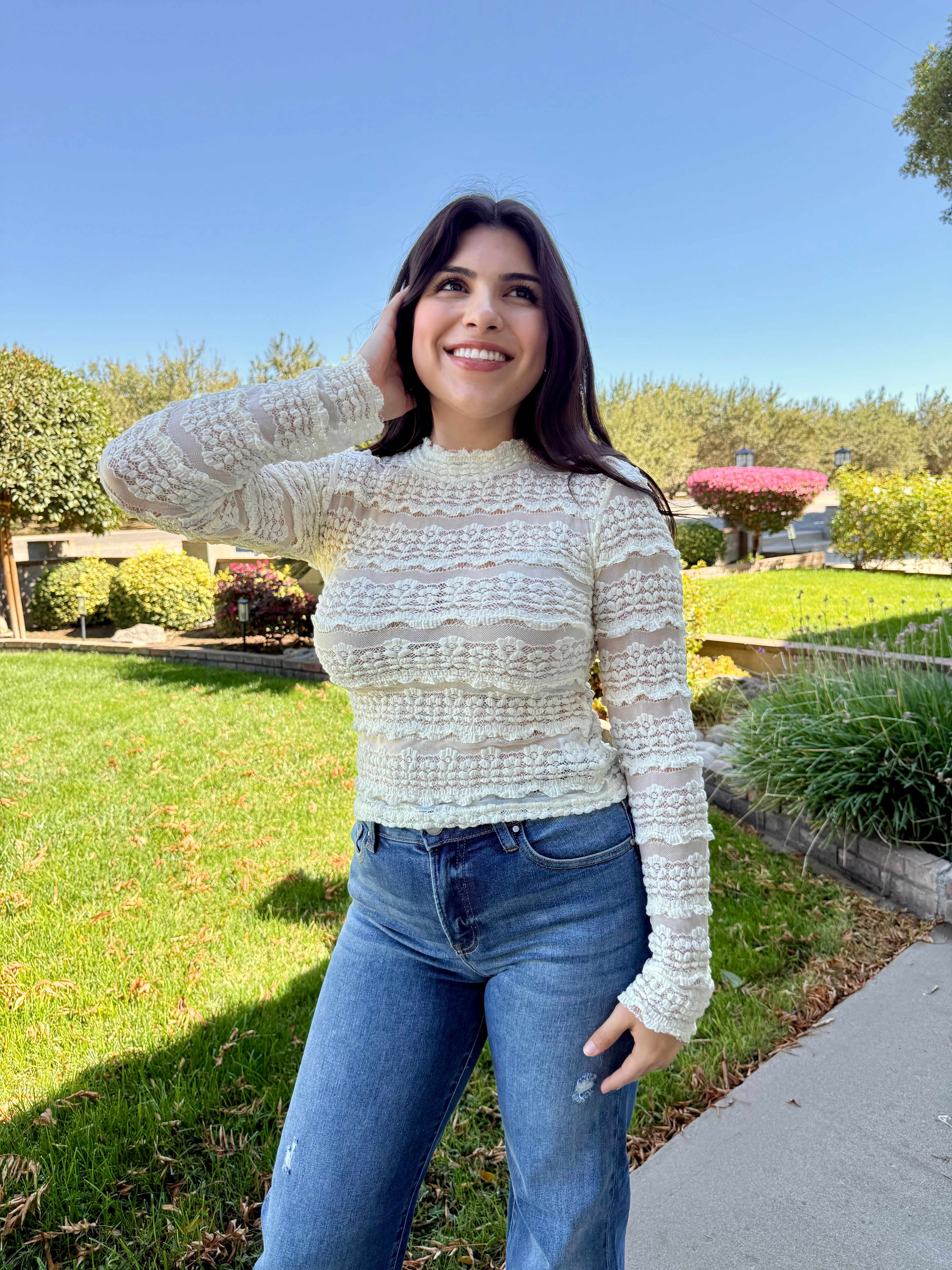 Elevate your everyday style with the Lace Textured Long Sleeve, designed for the modern woman who loves a touch of romance. Featuring delicate floral lace with subtle ruffle details, this semi- sheer blouse brings a timeless elegance to any outfit. The high neckline and fitted silhouette make it perfect for both casual days and dressed-up evenings.