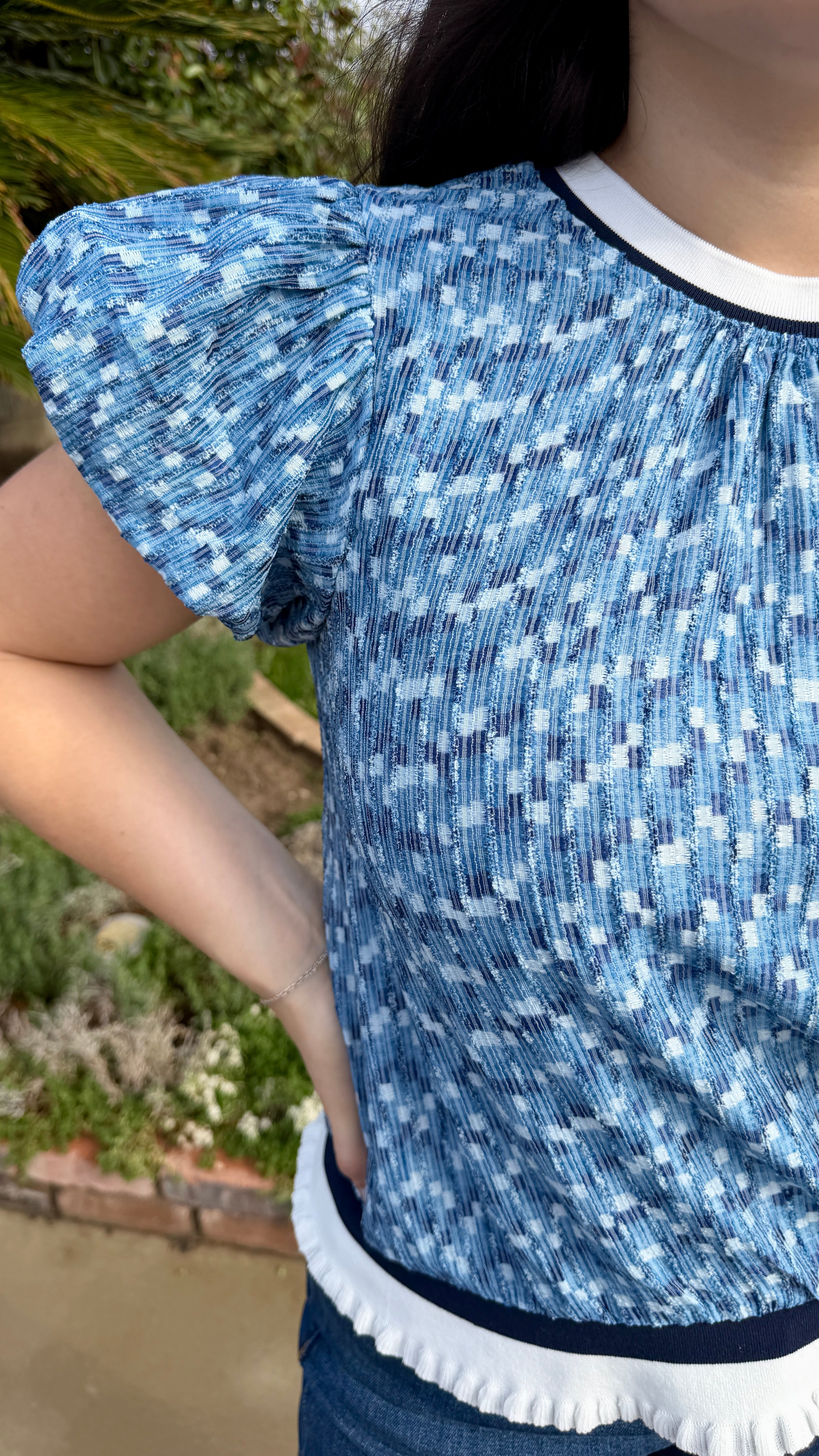 This top is the perfect mix of comfort and elevated style. Featuring a soft, textured knit with a subtle blue pattern, it’s designed to feel as good as it looks. The puff sleeves add a feminine touch, while the relaxed fit and banded hem create a flattering silhouette that’s easy to wear all day.