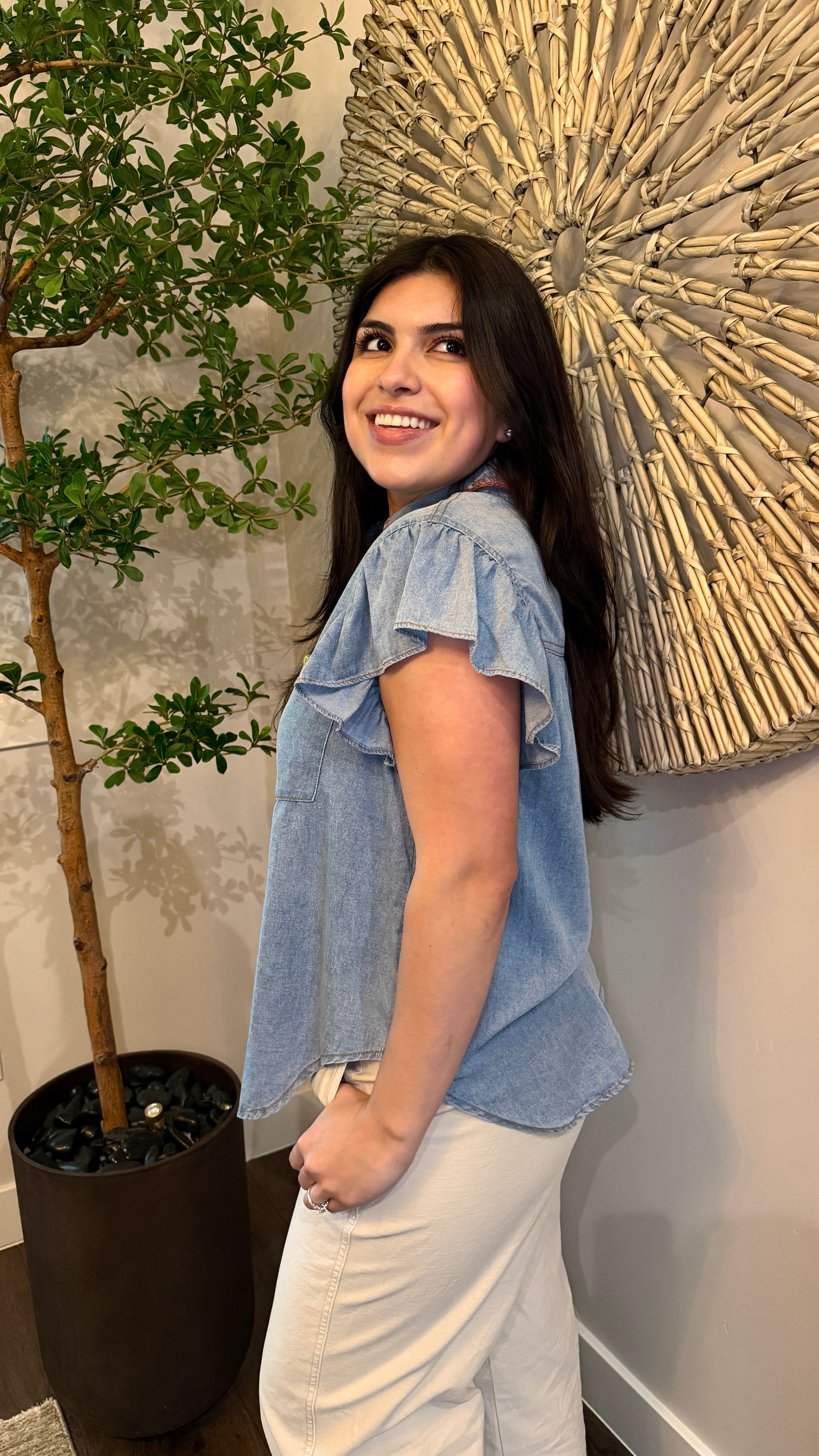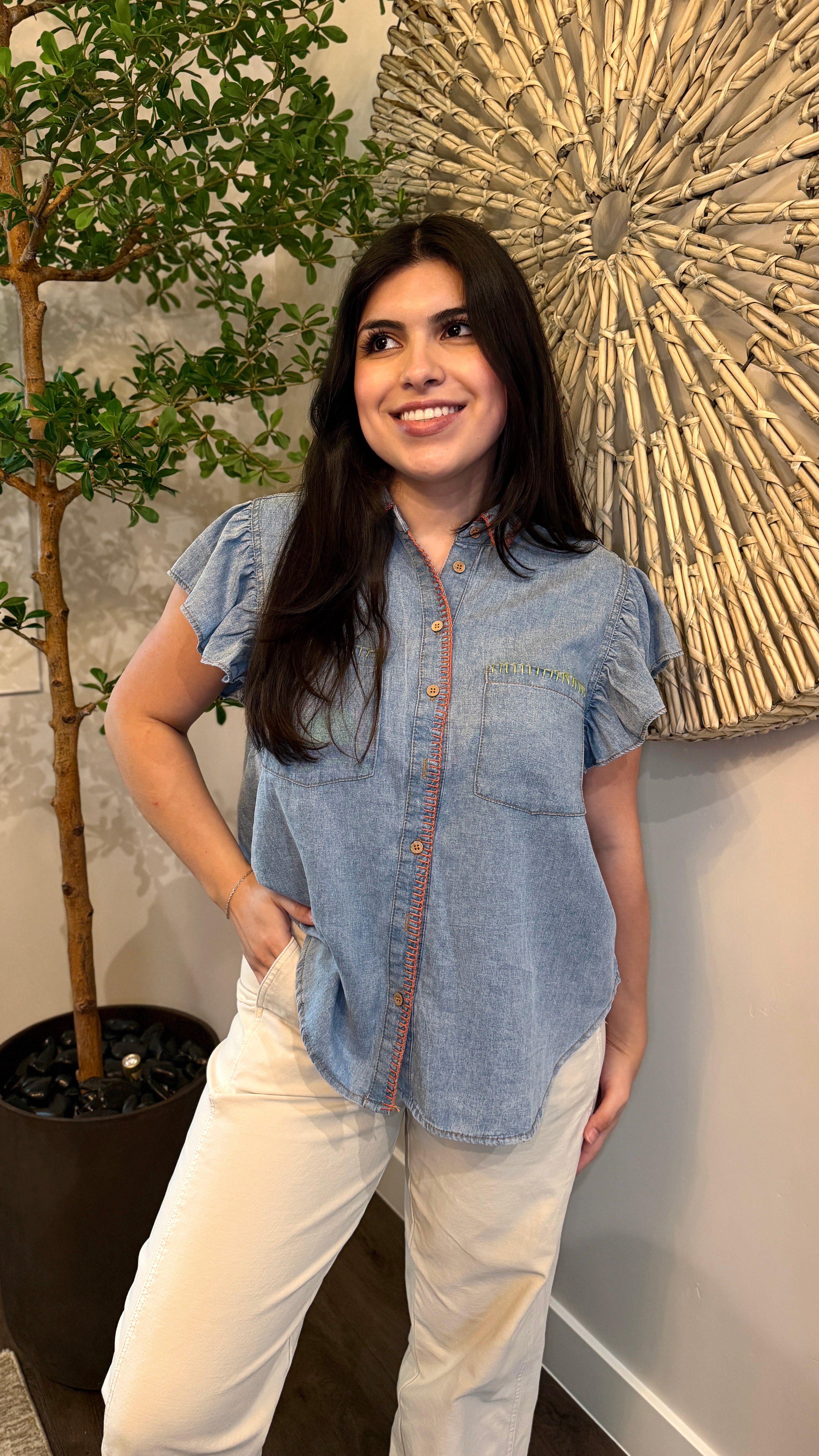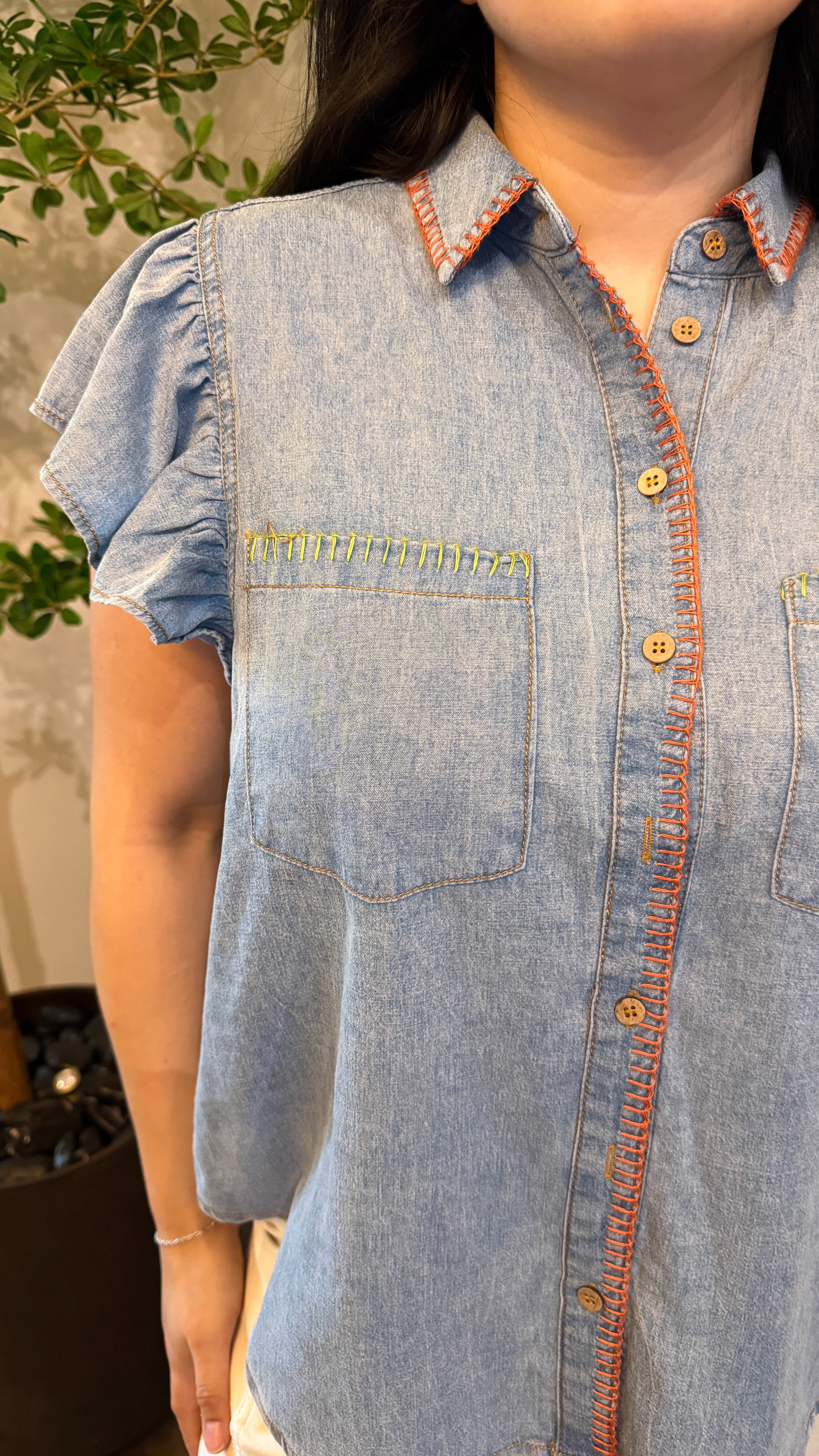 This classic denim button down is a closet essential you’ll reach for again and again. Designed with flattering short sleeves and a relaxed, easy fit, it delivers an effortlessly cool look while staying comfortable all day long. Delicate orange embroidery runs along the button placket for a warm pop of color, while green embroidered accents on the chest pockets add a fresh, eye-catching contrast. These thoughtful details elevate the timeless denim silhouette with a subtle, western-inspired touch.