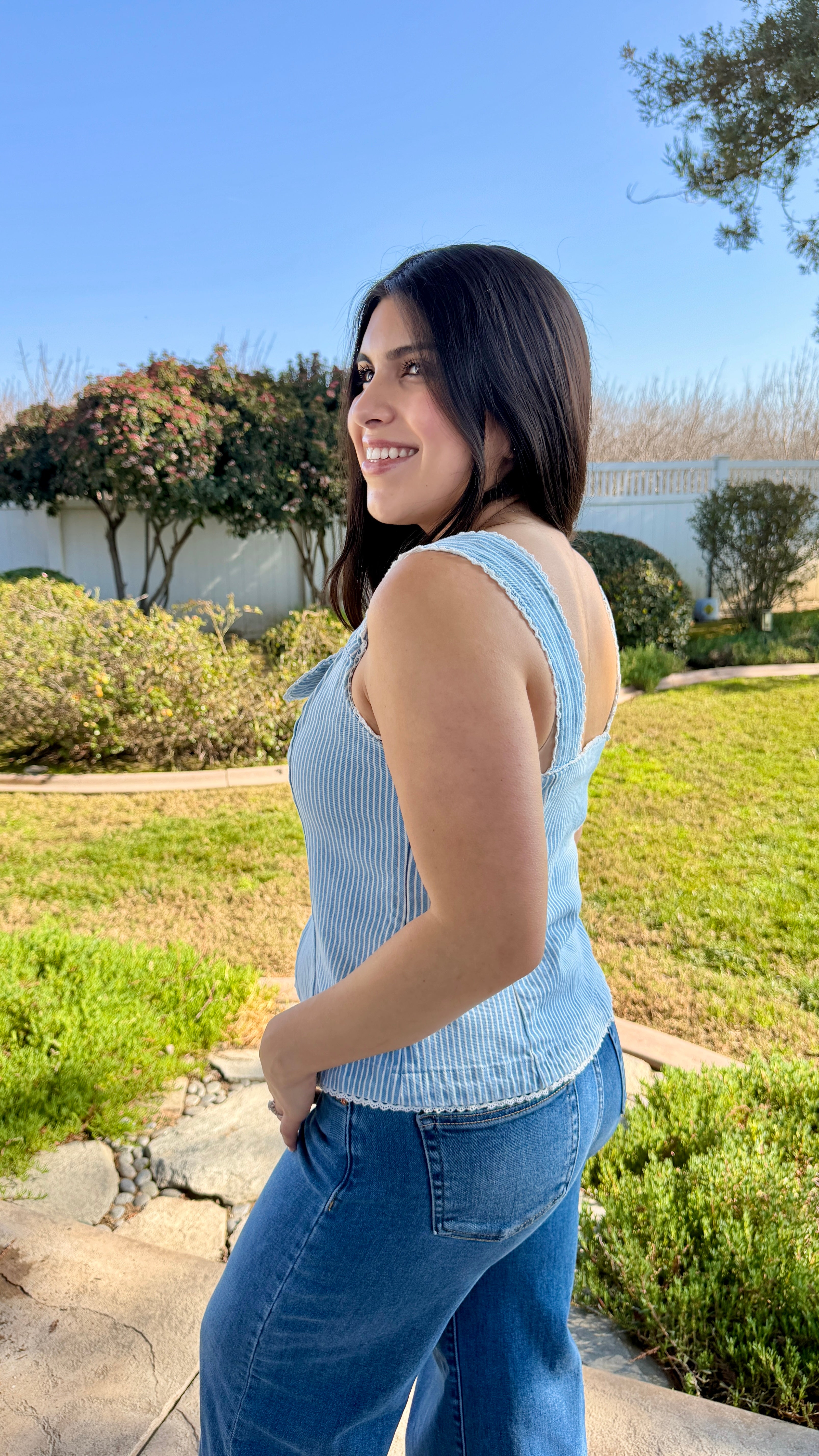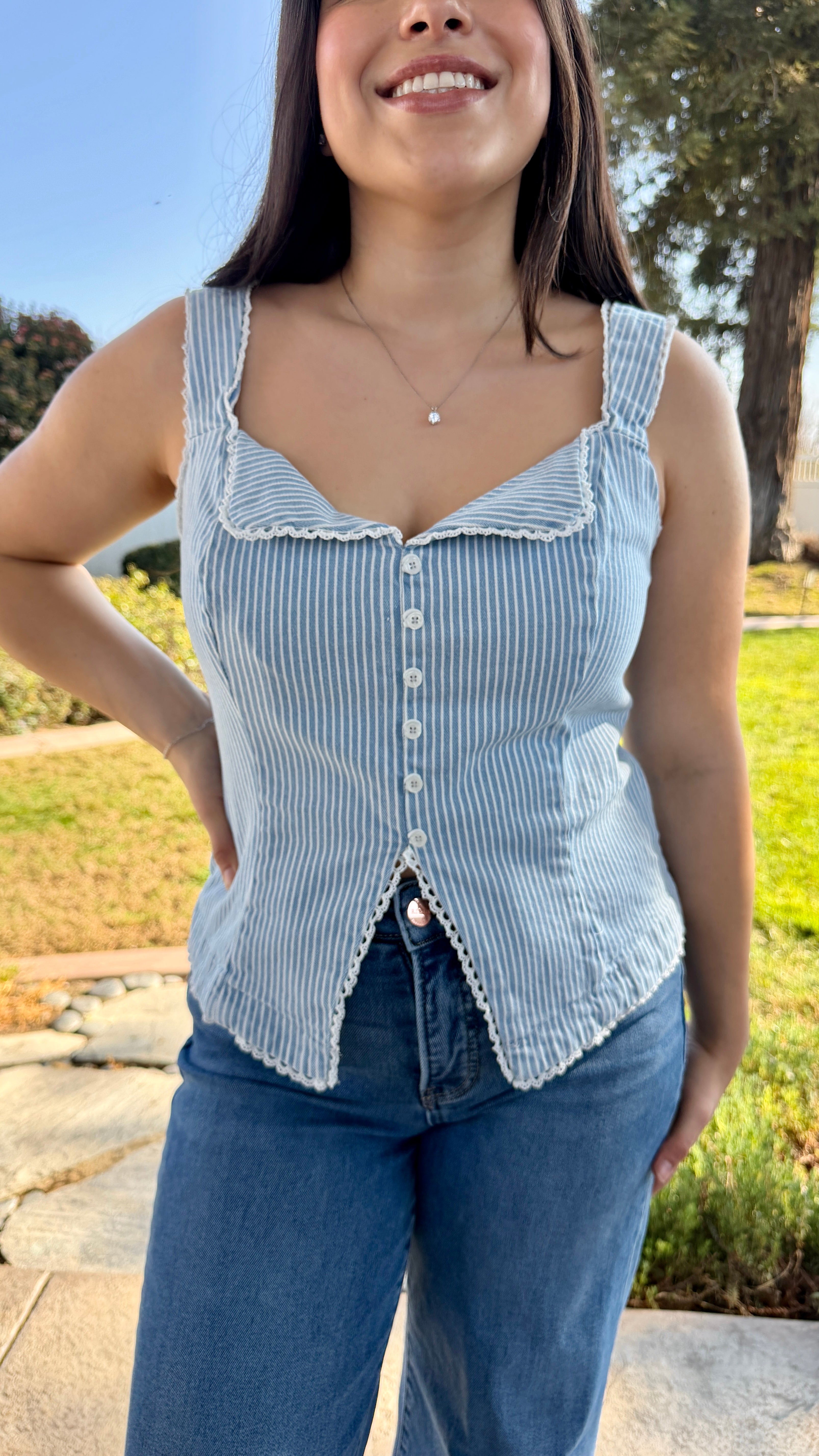 Elevate your everyday look with this feminine washed denim vest, featuring delicate lace trim and slimming vertical stripes. Its structured, fitted silhouette and charming front slit create the perfect balance of romantic detail and effortless style. Perfect for summer outfits, it pairs beautifully with matching shorts, skirts, or your favorite denim for a polished, put-together look.